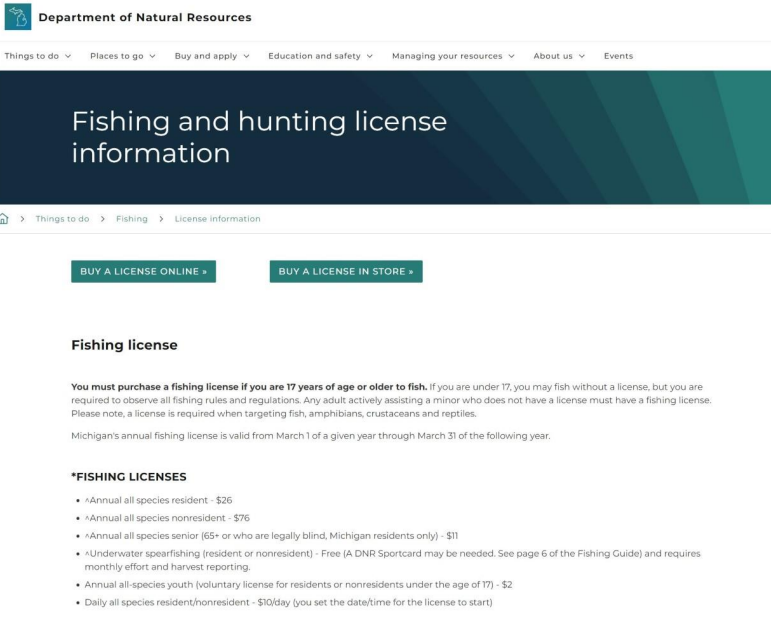 Home Page for Michigan DNR Website for Fishing Licenses or Non-Resident Three-Day Permits ($10 per Day)